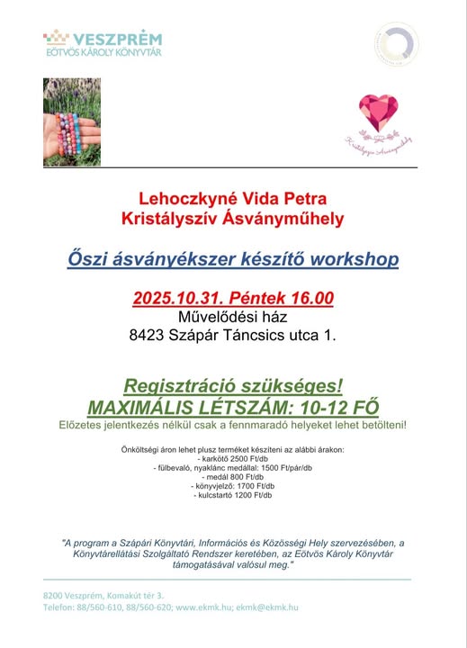A Veszprém Vármegyei Eötvös Károly Megyei Könyvtár szervezésében különleges kézműves élmény várja az érdeklődőket Szápáron: 2025. október 31-én, pénteken 16:00 órától kerül megrendezésre az "Őszi ásványékszer készítő workshop", ahol a résztvevők saját kezűleg alkothatnak egyedi kristályszív ékszereket.