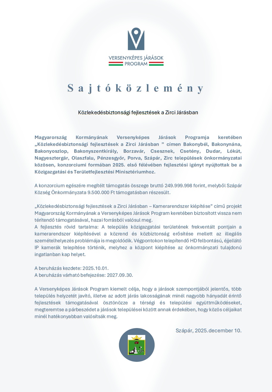 Közlekedésbiztonsági fejlesztések a Zirci Járásban. Magyarország Kormányának Versenyképes Járások Programja keretében "Közlekedésbiztonsági fejlesztések a Zirci Járásban " címen Bakonybél, Bakonynána, Bakonyoszlop, Bakonyszentkirály, Borzavár, Csesznek, Csetény, Dudar, Lókút, Nagyesztergár, Olaszfalu, Pénzesgyőr, Porva, Szápár, Zirc települések önkormányzatai