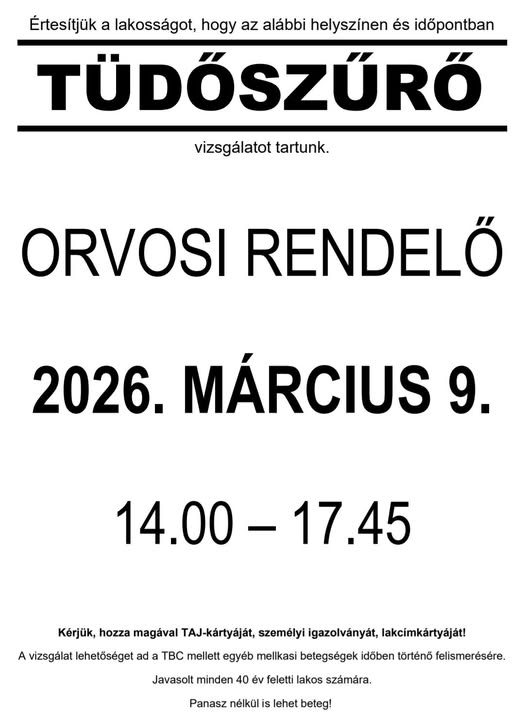 Értesítjük a lakosságot, hogy 2026 március 9-én, Tüdőszűrést tartunk az orvosi rendelő előtt. Bővebb információ a cikkben!